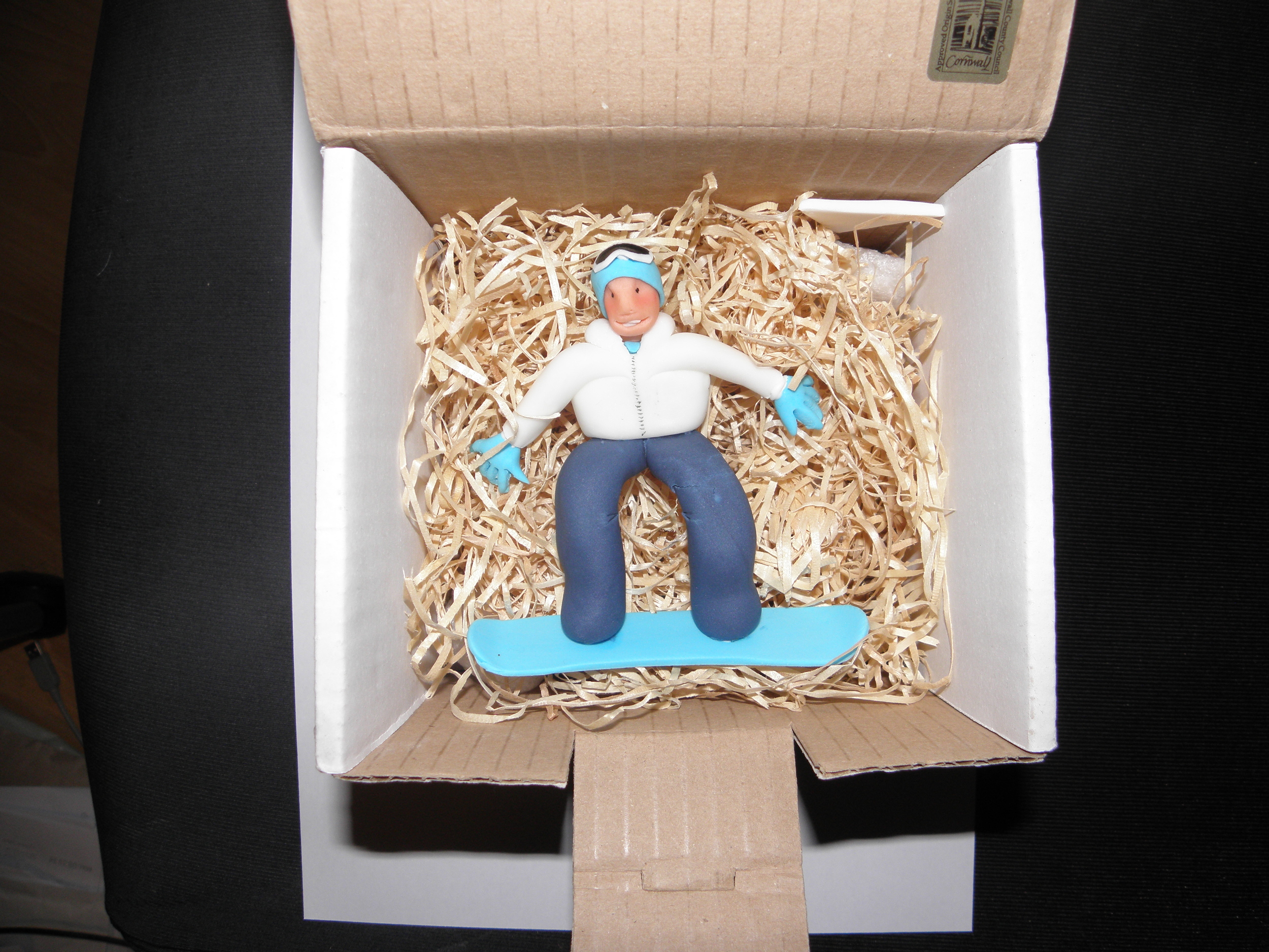 Well, she is throwing a surprise party for her husband's birthday and I'd offered to make a sugar snowboarder for the top of the cake. And here he is...